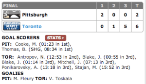 A partida começou melhor para os Penguins que marcaram dois gols no primeiro período. No segundo período os Maple Leafs diminuíram a diferença marcando um gol, porém no terceiro período os Maple Leafs dominaram a partida e anotaram 5 gols!!!!! Uma grande vitória para o time de Toronto, de virada, que espero que anime os jogadores para manter esse nível de intensidade nos próximos jogos.