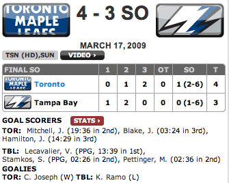 Steven Stamkos e Martin St. Louis perderam seus chutes, jogando o puck na trave! Jeff Hamilton anotou para os Leafs na primeira rodada dos pênaltis. Somente na terceira rodada Vincent Lecavalier empatou o jogo, os pênaltis para rodadas extras. Na quinta rodada, Nikolai Kulemin também teve a trave como inimiga! Com erros de ambas as partes chegamos à sexta rodada, e após Curtis Joseph defender o chute de Evgeny Artyukhin, John Mitchel marcou e garantiu a vitória para os Leafs.