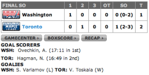 No final a partida foi para o overtime, sem gols e acabou indo para a decisão no Shootout, onde Vesa Toskala salvou as tentativas do próprio Ovechkin e de Eric Fehr e os Leafs marcaram com Phil Kessel e Niklas Hagman novamente!