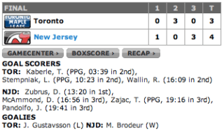 A partida estava definida com o placar de Leafs 3, Devils 1, até os 16m56s do terceiro período, quando os Leafs simplesmente ficaram perdidos no gelo e, em 3m4s, permitiram aos Devils 3 gols, virando a partida e dando adeus aos 2 pontos que achava já ter conquistado.
