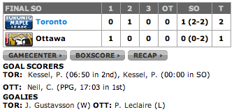 Felizmente a noite era de Phil Kessel … Kessel conseguiu empatar para os Leafs no segundo período, com assistência de Tyler Bozak, e nos pênaltis, conseguiu vencer o goleiro dos Senators, Pascal Leclaire, dando a vitória ao time de Azul e Branco !!!!!