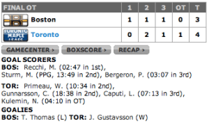 Conseguimos levar o jogo para a prorrogação … e, no último minuto de jogo, Nikolai Kulemin faz um lindo gol, fintando a defesa e o goleiro Tim Thomas com um jogo de corpo … um belo gol e uma bela vitória do time dos leafs ..