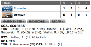 Os Senators não conseguiram se aproveitar do fato de jogarem em casa e, Phil Kessel começou a demolir as chances de vitória dos Senators, logo no primeiro período, com seu 26º gol da temporada.