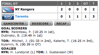 Como o placar não se alterou mais, fomos para a prorrogação com os Rangers e Nikolai Kulemin aos 39s, marcou para os Leafs, que consegue a vitória em 7 dos 6 últimos jogos. Gustavsson conseguiu sua sexta vitória seguida.
