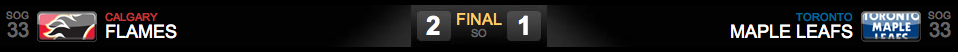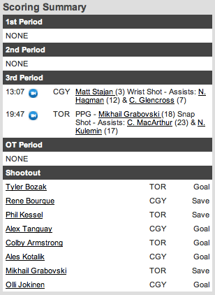 Os Leafs começaram bem, com um gol de Bozak e uma defesa de Giguere, porém na sequência, Phil Kessel perdeu sua tentativa e Alex Tanguay marcou, num gol meio esquisito, com o puck entrando devagarzinho no gol de Giguere. Na terceira tentativa, tanto Colby Armstron, quanto Ales Kotalik também marcaram. Fomos então ao quarto chutador … Grabovski pelos Leafs e Olli Jokinen pelos Flames. Grabo que sempre foi um ótimo chutador de pênaltis, perdeu o controle do puck e o jogo foi decidido por Olli Jokinen que venceu Giggy!