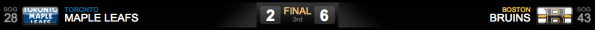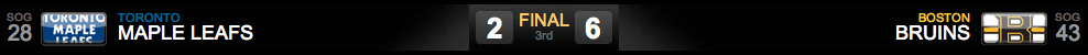 O terceiro período mal começou e os Bruins, com Milan Lucic, marcou aos 2m08s. Os Leafs não conseguiam jogar tão fisicamente quanto os Bruins e em muitos powerplays para os Leafs, parecia que quem estava em vantagem numérica era o time de Boston! Aos 10m08s Patrice Bergeron marcou e aos 11m43s foi a vez de Tyler Seguin! Os Leafs estavam realmente perdidos, assim como a partida, mas Nikolai Kulemin deu um jeito de marcar aos 12m32s, sem muita comemoração, afinal a partida já estava decidida! Neste período foram 14 chutes para os Bruins e apenas 7 para os Leafs.
