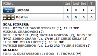 No primeiro período, os Leafs pareciam estar cansados, ou com sono, mas mesmo assim, David Steckel abriu o placar aos 7m29s. Todos já pensavam que os Leafs conseguiriam mais uma vitória, mas os Bruins dominavam e num powerplay onde Matt Frattin cometeu Interference, Nathan Horton aproveitou a chance e empatou para o time da casa, aos 10m32s. Os Leafs continuavam lentos, e Joffrey Lupul cometeu um tripping, deixando os Bruins novamente em vantagem numérica, que deu à eles o gol da virada aos 16m05s, com Zdeno Chara. Antes de terminar o período o Bruins ainda aumentou o placar com Chris Kelly às 17m49s. Foram uma chuva de tiros ao gol, que desta vez estava sendo guardado por Jonas Gustavsson, pela primeira vez na temporada. Os Bruins deram 18 chutes à gol contra apenas 7 dos Leafs.