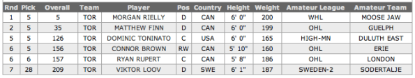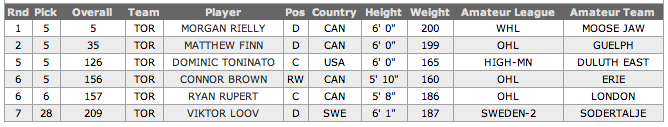 Após escolherem Morgan Rielly e Matthew Finn na primeira e segunda rodadas, respectivamente, os Leafs somente voltaram a escolher algum jogador na quinta rodada.