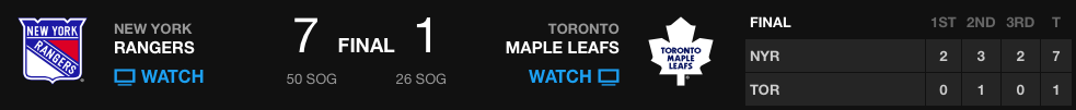Os Leafs perderam as duas partidas jogadas este ano contra os Rangers e, no histórico das últimas sete partidas, perderam seis. Se olharmos as partidas jogadas em casa, das últimas seis, os Leafs perderam cinco!