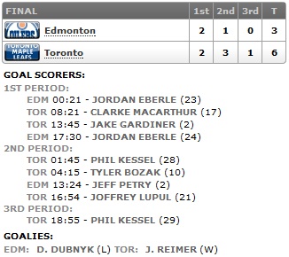O jogo começou bastante agitado, com os dois times dando mais enfoque ao seu papel ofensivo que ao defensivo, e o primeiro gol saiu logo aos 21 segundos de partida com Jordan Eberle dando a vantagem aos visitantes. O empate dos Leafs veio oito minutos depois, quando Clarke MacArthur converteu após Toronto pressionar bastante. Os Leafs chegaram a virar com Jake Gardiner (e bela jogada de Mikhail Grabovski), mas Eberle marcou de novo no final do período e fechou o placar em 2-2 na primeira etapa. Os Oilers chegaram a marcar mais um gol com Ryan Smith, mas foi – erroneamente – anulado.