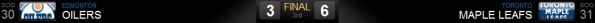 O terceiro período foi menos movimentado na questão de gols, mas os dois times seguiram dando trabalho para os goleiros adversários: James Reimer chegou a fazer ótimas defesas para manter os Leafs na frente. Faltando pouco mais de dois minutos para o encerramento do jogo, os Oilers tiraram seu goleiro, Devan Dubnyk, para utilizarem um atacante extra, mas que aproveitou a oportunidade foi Phil Kessel, que chutou de longe e acertou o gol vazio.