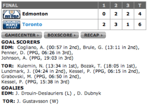 Os Leafs começaram o jogo arrasando os Oilers … Aliás, os Leafs são o 29º time da NHL, e os Oilers o 30º! Ou seja os dois últimos times da liga estavam se enfrentando …