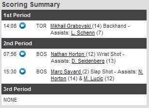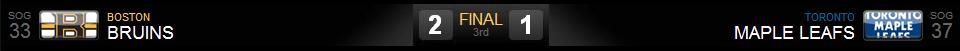 No terceiro e derradeiro período os Leafs voltaram com vontade de, pelo menos, empatar a partida e realmente houveram várias chances de gol, porém Tuukka Rask conseguia realizar defesas espetaculares e, até mesmo, quando os Leafs pediram tempo nos segundos finais da partida e armaram uma jogada para um último chute à gol, Tuukka Rask defendeu um belo chute de Phil Kessel. Placar final Bruins 2 – Leafs 1.