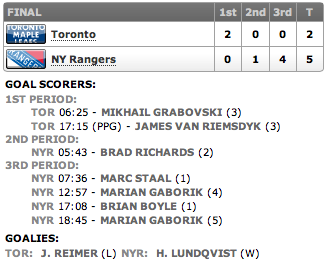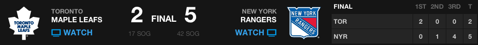 A estréia de St. Louis foi apagada pela performance dos Leafs, que conseguiram segurar Rick Nash, Brad Richards, St. Louis e outros ótimos jogadores do time dos Rangers por dois períodos inteiros!