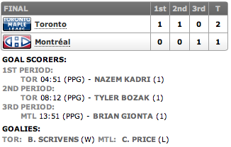 Os Leafs começaram bem o jogo, mas quase tomou o primeiro gol, nos primeiros minutos da partida, num chute de Brandon Prust, mas claramente um jogador dos Canadiens acabou empurrando Ben Scrivens e o gol foi corretamente anulado. Foi Nazem Kadri que abriu o placar aos 4m51s, em powerplay (Erik Cole estava no banco de penalidades desfalcando os Canadiens), e marcou o primeiro gol dos Leafs na temporada, cruzando a frente do gol de Carey Price, recebendo um passe de Phil Kessel e desferindo um belo chute, não defendido por Price, que demorou a se posicionar, pois havia pensado que o puck não havia sido controlado por Kadri! As assistências foram de Phil Kessel e Mike Kostka.