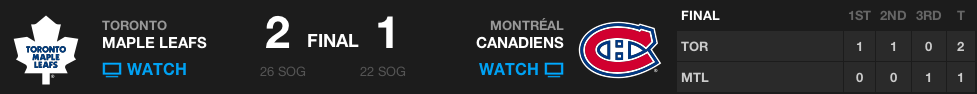 Foi um jogaço dos Leafs que deixaram os Habs embaraçados em casa, devolvendo a derrota sofrida no ano anterior. Reimer foi uma muralha, a defesa funcionou e o ataque foi matador. Outro jogador que tem jogado muito é Tyler Bozak, que em face-offs é um especialista.