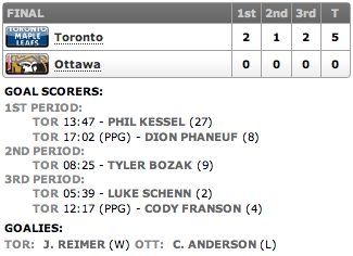 No total foram 49 chutes dos Senators defendidos por James Reimer, contra 35 chutes defendidos por Craig Anderson. Foi o segundo shutout consecutivo de Reimer!