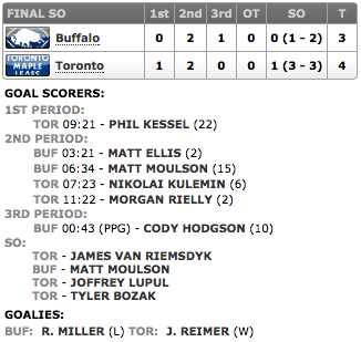 Os Leafs estão ficando especialistas no shootout. Só nesta temporada, contando com este jogo, já foram 13 jogos decididos no shootout com 9 vitórias dos Leafs! Todos os batedores dos Leafs marcaram seus gols. James Van Riemsdyk, Joffrey Lupul e Tyler Bozak, este último conta do com um pouco de sorte pois seu chute foi parcialmente defendido por Miller, mas acabou entrando lentamente no gol. Pelos Sabres, somente Matt Moulson marcou, na primeira rodada.