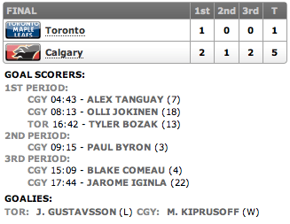 Apesar da quarta derrota seguida, com um placar desfavorável de 5 a 1, os Leafs jogaram bem muito que no jogo anterior, contra os Canadiens! Gustavsson também jogou muito bem e realizou muitas defesas importantíssimas! O resumo do jogo é que os Flames conseguiram aproveitar as oportunidades dadas por erros dos Leafs!