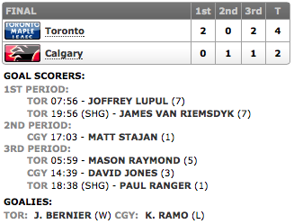 Foi a primeira derrota dos Flames em casa, apesar de o time não ter jogado mal. Jonathan Bernier roubou a partida para os Leafs, sendo muito seguro e fechando o gol, impedindo o time de Calgary de ter alguma reação.