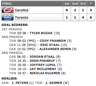 O terceiro e decisivo período começou e os Leafs ainda pareciam perdidos. Aos 06m55s foi a vez de Jordan Staal marcar o terceiro gol do time visitante, virando a partida em pleno Air Canada Centre. Somente após a metade do período os Leafs acordaram e voltaram a pressionar. Aos 14m35s, os Leafs trocaram muitos passes no ataque até que Dion Phaneuf acertou um chute potentíssimo, uma bomba, indefensável para Justin Peters. Partida empatada. Aos 16m50s, todos foram presenteados com uma belíssima jogada de Joffrey Lupul, que recuperou o puck na defesa, conduziu o puck até o ataque com muita velocidade, passou por Joe Corvo e cruzou em frente ao gol, marcando o gol da vitória dos Leafs. Um golaço!! Com apenas um gol de diferença já era esperado que os Hurricanes tentariam o empate. Na tentativa de ter maiores chances de marcar, os Hurricanes ficaram sem goleiro, colocando um atacante a mais no gelo. Os Leafs conseguiram se defender e num rápido contra-ataque, aos 19m15s Nikolai Kulemin passou para Jay McClement marcar com o gol vazio, o quinto gol dos Leafs. Novamente sem goleiro, aos 19m57s, o próprio Nikolai Kulemin partiu em altíssima velocidade, sozinho, quase perdeu o controle do puck, mas conseguiu marcar o sexto gol dos Leafs, fechando o placar e a vitória!