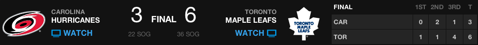 Os Leafs parecem estar embalados e na direção certa este ano. Vindos de uma vitória em casa contra o Flórida Panthers os Leafs buscavam nova vitória, agora contra os Hurricanes.