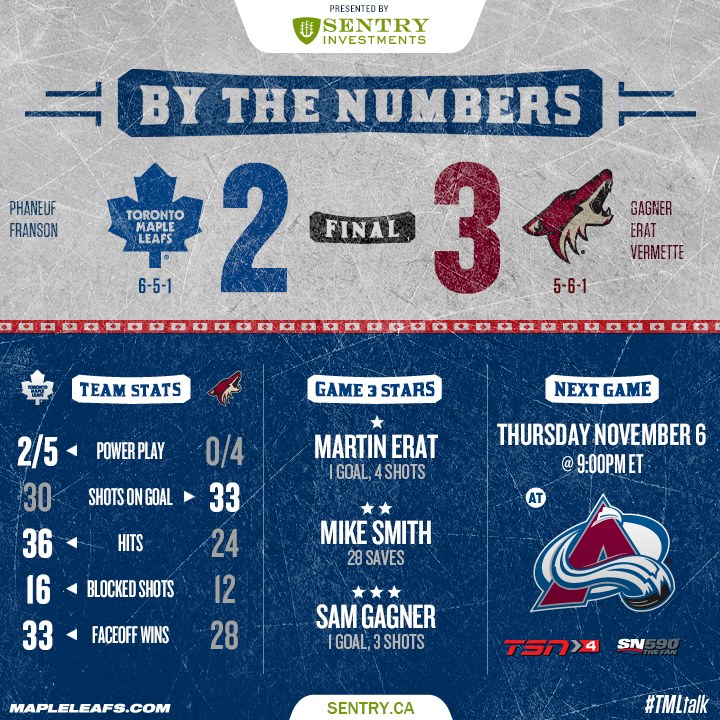 Neste jogo os Leafs iniciaram a partida sem energia enquanto os Coyotes pressionavam. Os Leafs cometiam seguidos erros e um destes erros, um passe de Jake Gardiner, foi interceptado atrás do gol dos Leafs, por Lauri Korpikoski, que passou para Sam Gagner chutar forte por sobre o ombro de James Reimer, que não teve muito a fazer para defender tal chute aos 10m29s. Ainda no primeiro período, Martin Erat marca aos 15m35s quando seu chute é desviado na lâmina do skate de Stephane Robidas, também deixando Reimer sem chance de defesa. Durante todo o primeiro período os Leafs deram somente três chutes à gol, o que realmente não deu muita chance de se impor na partida.