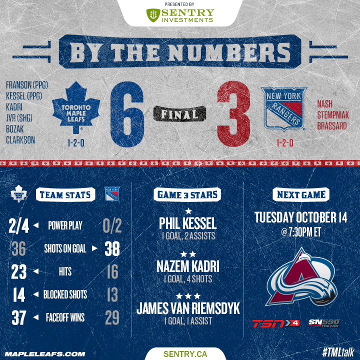 Sem nenhuma vitória na temporada após dois jogos em casa, contra os Habs e os Penguins, os Leafs foram a New York para enfrentar os Rangers e mudar o rumo da equipe de Toronto.