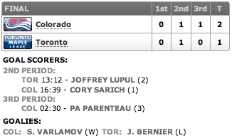 Os Leafs conseguiram jogar bem desde o início da partida e James Reimer foi sólido no gol, dando chance aos Leafs de vencerem os Avalanche na casa do adversário.