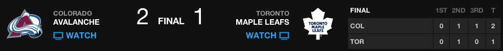 - Avalanche 2, Maple Leafs 1 (wyff4.com)