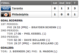 - Bolland, Kessel move Leafs (2-0) by Flyers (scores.espn.go.com)