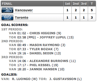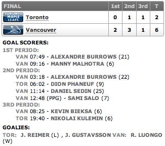 O Toronto Maple Leafs, que vem numa boa fase, tendo vencido os dois últimos jogos, receberam a visita dos irmãos Sedin, Vancouver Canucks.