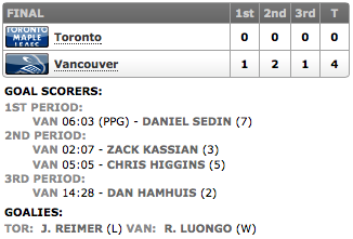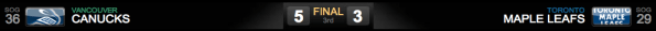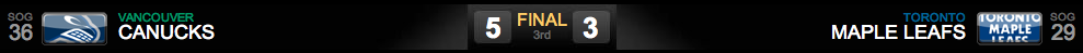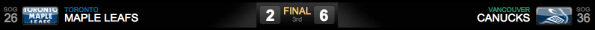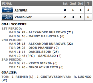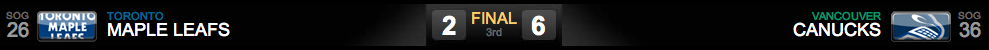 Os Leafs ainda veriam mais um gol dos Canucks no terceiro período. Desta vez foi Kevin Bieksa que marcou, aos 8m25s. O restante do jogo os Leafs tentaram, tentaram, mas foram parados por Roberto Luongo. Faltando apenas 20 segundos para o término da partida, os Leafs marcaram seu segundo gol com Nikolai Kulemin, e saíram de Vancouver com uma derrota por 6 a 2.