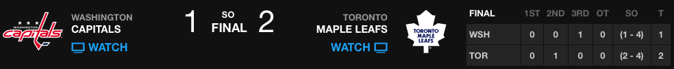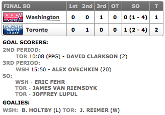 A partida se decidiu nos pênaltis (shootout) e, quem se saiu melhor foi James Reimer. Após sofrer um gol de Eric Fehr na primeira rodada, James Van Riemsdyk empatou para os Leafs na segunda e Mason Raymond acabou perdendo o controle do puck na terceira. Ovechkin e o outro jogador dos Caps também foram defendidos por Reimer e a decisão foi para a quarta rodada de pênaltis. Joffrey Lupul marcou, vencendo Braden Holtby e o chute de Troy Brower foi por cima do gol de Reimer!!