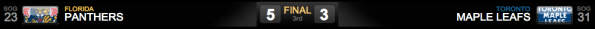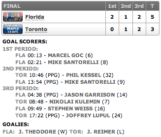 Neste jogo foi clara a diferença entre o goleiro dos Panthers, Jose Theodore, com sua experiência, salvando vários chutes dos Leafs nos momentos de pressão do time! Reimer acabou não conseguindo defender os dois priemiros chutes e ainda deu rebote para a frente do gol dos Leafs!Apesar dos Leafs chutarem mais a gol (31 x 23), o goleiro dos Panthers e a defesa conseguiu assegurar a vitória.