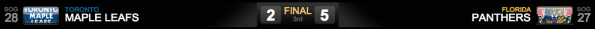 Os Leafs estiveram muito melhor que os Panthers na partida, mas não conseguiram sair com a vitória. No primeiro período, apesar de liderar o tempo de posse do puck e de liderar por 11 a 4 o número de chutes à gol, os Leafs saíram perdendo por 1 a 0, num gol dado a Erik Gudbranson logo aos 1m57s. Gudbranson chutou de próximo à linha azul e, na verdade o puck foi desviado para o gol de Reimer, caso contrário teria ido para fora.