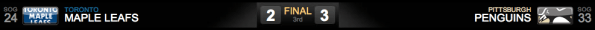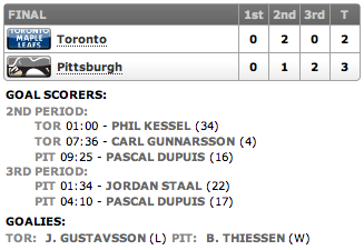 Aos 1m00s do segundo período, Phil Kessel abriu o placar para os Leafs, vencendo o goleiro Thiesen, pois Marc-Andre Fleury não jogou. Os Leafs ainda abriram dois gols de vantagem com Carl Gunnarsson aos 07m16s. Os Penguins só conseguiram diminuir aos 09m25s com Pascal Dupuis!