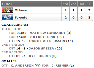 Kyle Turris abriu o terceiro período fazendo seu terceiro gol na temporada e também o terceiro dos Senators na partida. Os Maple Leafs tentaram correr atrás do prejuízo, mas resultado final foi uma vitória por 3-2, de virada, dos Senators.