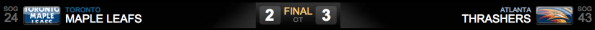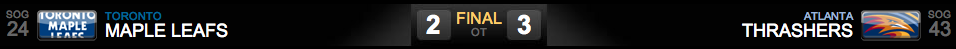 E vamos à prorrogação. Ambos times já somaram um ponto e apenas tentariam definir quem ganharia o outro. Os Leafs demonstraram cansaço e não conseguiram levar perigo ao gol dos Thrashers e, sequer conseguiram segurar os Thrashers nos 5 minutos da prorrogação. Ron Hainsey marcou o gol da vitória dos Thrashers aos 02m31s da prorrogação.