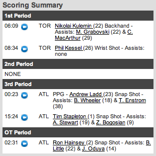 Os Leafs, que ontem perderam dos Penguins no shootout, logo após a partida voou de Toronto para Atlanta para um jogo às 17h00, horário local. Sabendo que a equipe já vem de um jogo difícil na última quinta-feira, contra os Canadiens, podemos ter certeza de que o time estaria cansado no gelo.