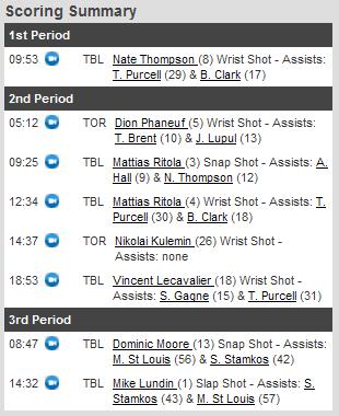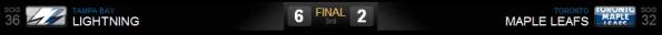O Tampa Bay Lightning foi a Toronto com vontade e garra para que os Leafs não tivessem uma vitória fácil! Acabaram conseguindo anular a equipe da casa. Os Leafs por sua vez não se aproveitaram de estarem jogando no Air Canada Centre, com seus torcedores apoiando e não demonstraram a energia necessária para sobrepujar os visitantes.