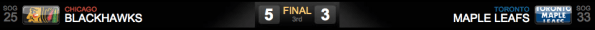 Dessa vez não teve jeito e Reimer foi substituído por Jean-Sebastién Giguere no início do terceiro período. Somente neste período o Toronto conseguiu segurar o potente ataque dos Blackhawks e diminuiu o placar com Joey Crabb aos 04m26s e com Luke Schenn aos 19m03s, mas já era tarde demais.Neste período, Grabovski sofreu penalti ao se dirigir ao gol de Crawford e os Leafs tiveram um penalty shot que poderia mudar a partida, mas infelizmente Grabo fez um movimento sensacional que foi defendido pela perna esquerda de Crawford (coisas de jogo). Crawford também defendeu um tiro à queima roupa de Mike Brown. Estes dois gols poderiam ter levado a partida à prorrogação, mas o placar final foi Blackhawks 5 x Leafs 3.