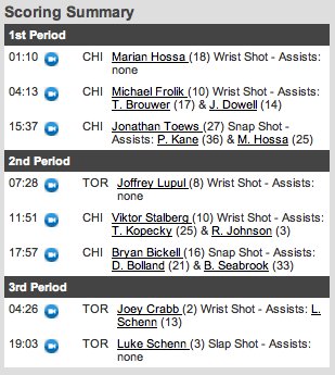 Os Leafs começaram o jogo muito devagar … lentos … pareciam que tinham jogado na noite anterior … e, mal começou o jogo quando Carl Gunnarsson, numa jogada que seria fácil, saindo da defesa dos Leafs, tentou fazer um passe longo para conectar com o ataque, mas entregou o puck para Marian Hossa. O excelente jogador dos Blackhawks não desperdiçou a chance e marcou o primeiro da partida aos 01m10s. James Reimer estava encoberto por um defensor, provavelmente Gunnarsson mesmo, e não defendeu o puck que entrou no meio de suas pernas! Com os Leafs ainda sonolentos, Michael Frolik aumentou para os Blackhawks aos 04m13s. Mais pro final do período, os Leafs tentavam chegar ao gol de Corey Crawford, mas o goleiro do Chicago estava numa noite excepcional e, aos 15m37s foi a vez do capitão dos Blackhawks, Jonathan Toews, marcar o terceiro, após receber um lindo passe de Patrick Kane que o deixou em frente ao gol.Placar no final do primeiro período, Blackhawks 3 x Leafs 0.