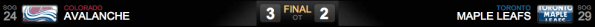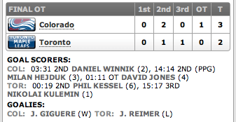 O terceiro período viu as equipes voltarem ao gelo com a vontade de vencer e, aos 15m17s, Nikolai Kulemin após não deixar o puck air da zona ofensiva, disputar o puck com um defensor, ainda foi ã frente do gol e recebeu um passe em frente a Giguere, driblou o goleiro e marcou o gol de empate!! Avalanche 2 x Leafs 2! Foi uma jogada inspirada de Kulemin! E fomos para a prorrogação, onde, infelizmente, David Jones aproveitou um rebote de James Reimer e marcou o gol da vitória Avalanche!