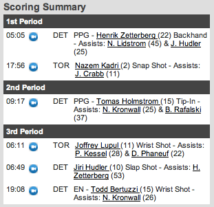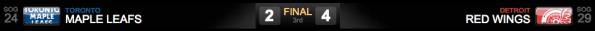 No finalzinho, com os Leafs sem goleiro,trocado por um atacante adicional, ação conhecida como Empty Net, Todd Bertuzzi se aproveitou de um bloqueio de um chute dos Leafs e marcou o quarto gol dos Red Wings. Final Leafs 2 – Red Wings 4.