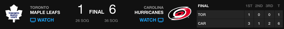 Os Leafs continuavam perdidos no jogo, sem qualidade nenhuma e nem mesmo um powerplay ajudou o time a reagir. Aos 35s do terceiro período, Jordan Stall marca para os Hurricanes com o time em desvantagem numérica (shorthanded). O restante do período viu os Leafs tentando jogadas no desespero e os 2 minutos finais acabaram sendo em powerplay para os Hurricanes que jogaram uma boa parte em 5 contra 3, quando aos 18m51s, Elias Lindholm aproveita um chute de Jeff Skinner que bateu na parede atrás do gol de Reimer e voltou, para marcar o sexto gol dos Hurricanes, fechando a noite.