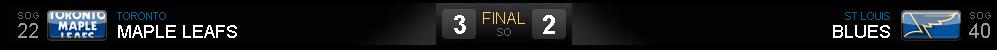Na prorrogação os Leafs não conseguiram sequer dar um chute ao gol de Halak, enquanto os Blues deram dois chutes, defendidos por Scrivens. Sem qualquer alteração no placar, os times foram para os penaltis (Shootout).