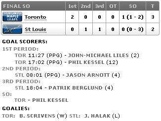 Para ajudar a equipe, o jogo foi em St. Louis, longe da torcida e também de toda a pressão de Toronto, e quem foi escolhido o goleiro para esta partida foi Ben Scrivens, fato que nos deixa com a impressão que Jonas Gustavsson, “The Monster”, não está com uma boa imagem junto ao Ron Wilson. Será que Gustavsson voltará ao gol dos Leafs antes de Reimer voltar?