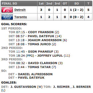 Com o empate no tempo regular, a partida foi para a prorrogação, que terminou sem gols, levando a decisão aos pênaltis. Os Red Wings não haviam vencido nenhuma disputa de pênaltis nesta temporada e isso colocava a pressão sobre eles. James Van Riemsdyk foi o primeiro a chutar pelos Leafs e foi defendido pelo “Monster”. Pelos Red Wings, Daniel Alfredsson, muito vaiado pela torcida dos Leafs, marcou para o time de Detroit. Mason Raymond também foi defendido por Gustavsson e, finalizando a partida, Pavel Datsyuk fez ótimo movimento e marcou para os Red Wings, dando a vitória ao time visitante.