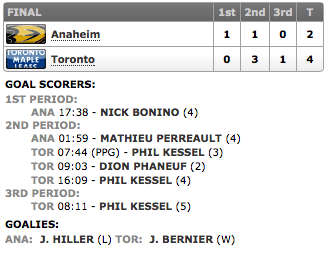 - Phil Kessel scores hat trick as Leafs down Ducks 4-2 (globalnews.ca)